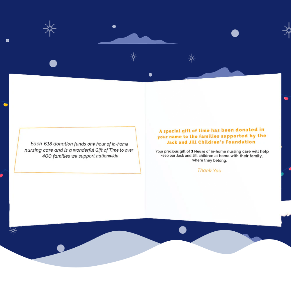 Jack and Jill’s mission is to empower families to care for their child at home, by funding and delivering nursing, respite and advocacy. Each €18 donation funds one hour of in- home nursing care and is a real ‘Gift of Time’ to the 400+ families supported by Jack and Jill, right around the country.